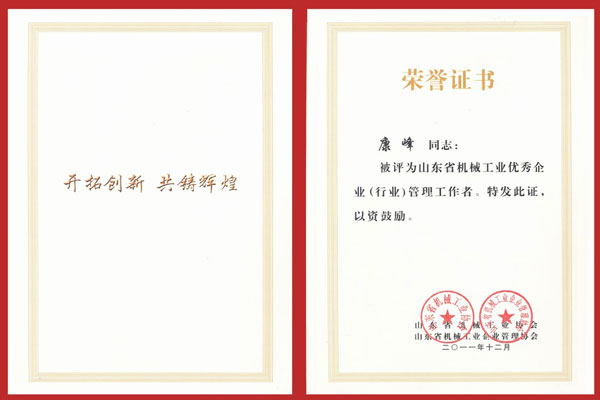 1月10日,山东省机械工业工作会议在泰安市东尊华美达酒店隆重召开,中国机械工业联合会特别顾问朱森第、山东省机械工业协会会长刘卫东、泰安市副市长闫新建等领导出席会议并颁奖。公司董事长、总经理康凤明,常务副总经理潘宪平、副总经理康峰等领导参加会议。董事长、总经理康凤明荣获“山东省机械工业优秀企业家”称号,副总经理朱洪臣荣获“山东省机械工业有突出贡献科技专家”称号,副总经理康峰荣获“山东省机械工业优秀企业(行业)管理工作者”称号。