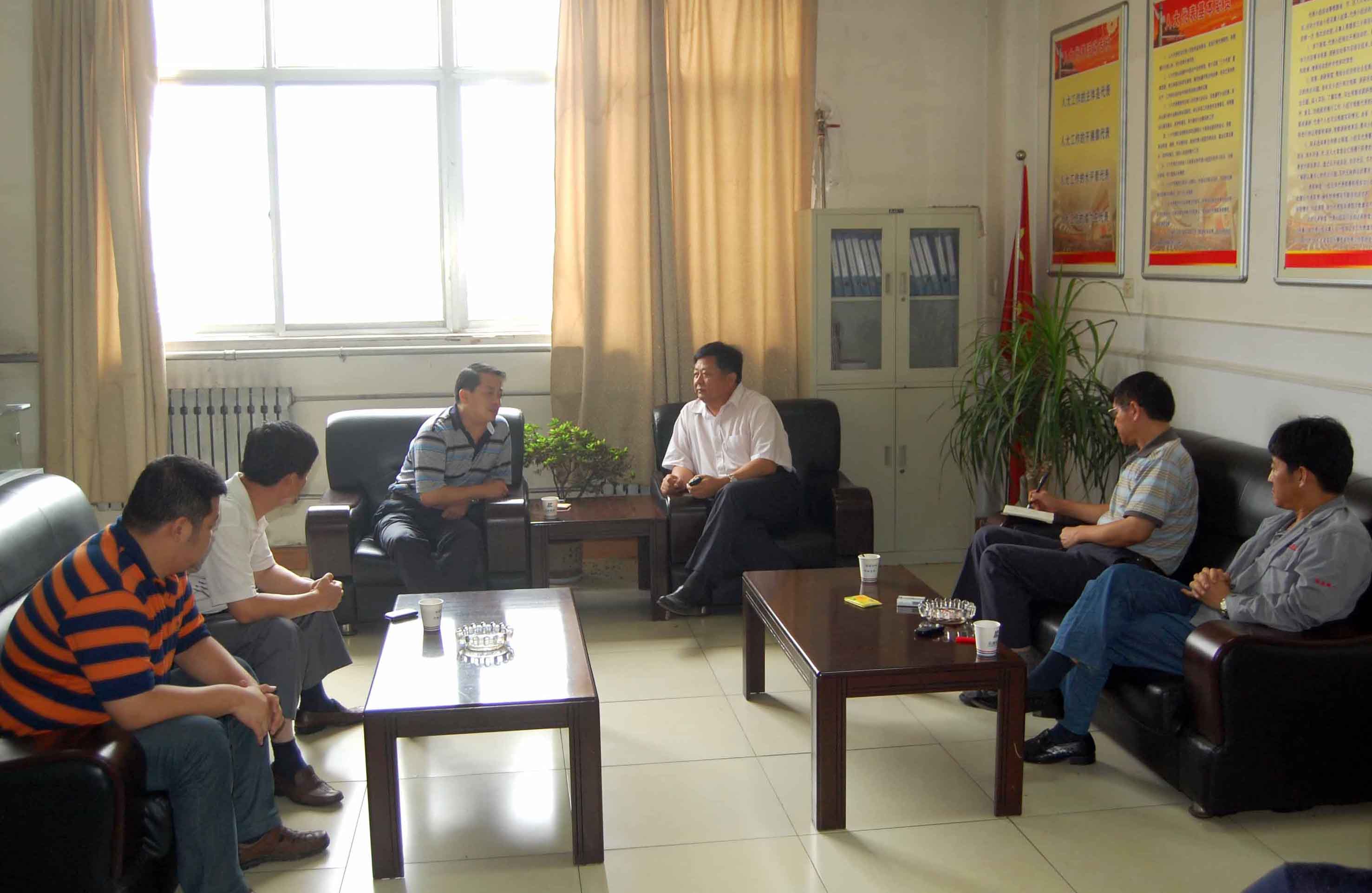 8月12日,山东省机械设计研究院院长林江海(右四)及滕州分院院长王桂东一行来公司考察洽谈数控机床开发事宜。公司董事长、总经理康凤明详细介绍公司情况,常务副总经理潘宪平,副总经理朱洪臣、副总经理康峰参加座谈。